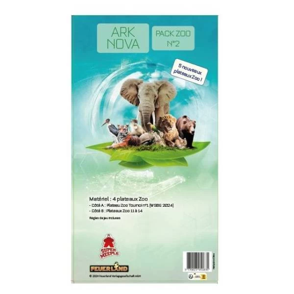 Ark Nova : Zoo Map Pack 2 propose cinq nouveaux modèles de zoo, avec le même design sur les quatre plateaux de jeu afin que les joueurs puissent s’affronter dans la même configuration et avec quatre plateaux de zoo différents avec des capacités nouvelles et intéressantes sur le côté opposé de ces plateaux de jeu.