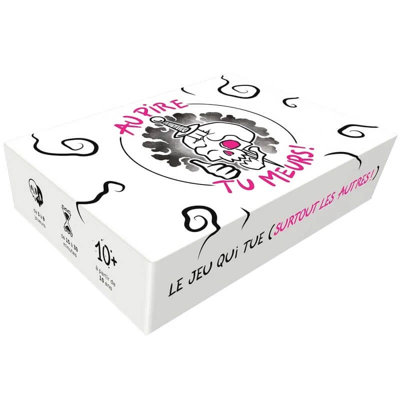Au pire, tu meurs ! est un jeu d’ambiance et de bluff. Le but ? Éliminer les autres membres de la famille Death en réduisant leur espérance de vie à zéro, et rester le dernier en vie.