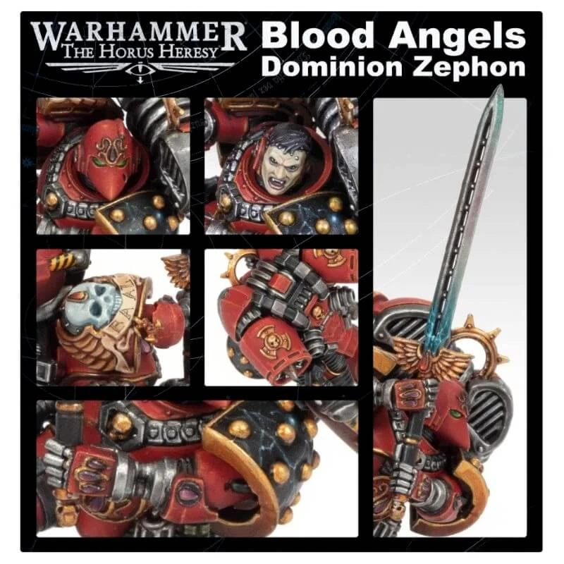 Sortant dans le cadre de la Black Library Celebration 2022, Dominion Zephon se jette au combat à l’aide de bioniques conçus par Arkhan Land, avec un réacteur dorsal et une armure ornés de motifs Blood Angels resplendissants. Il est armé de sa longue épée, le Spiritum Sanguis, et de pistolets volkite jumelés, nommés Lamentation et Chagrin.