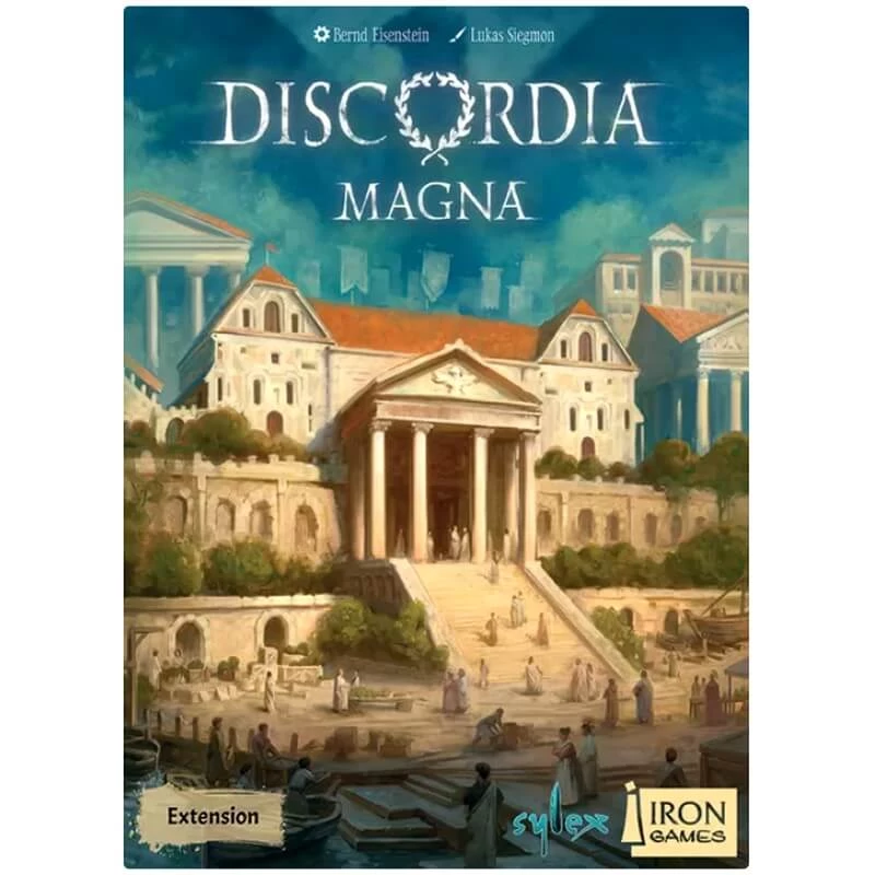 L’extension Discordia Magna contient 6 cartes de villes individuelles (plateaux de joueurs) ainsi que les tuiles Magna représentant les avant-postes.