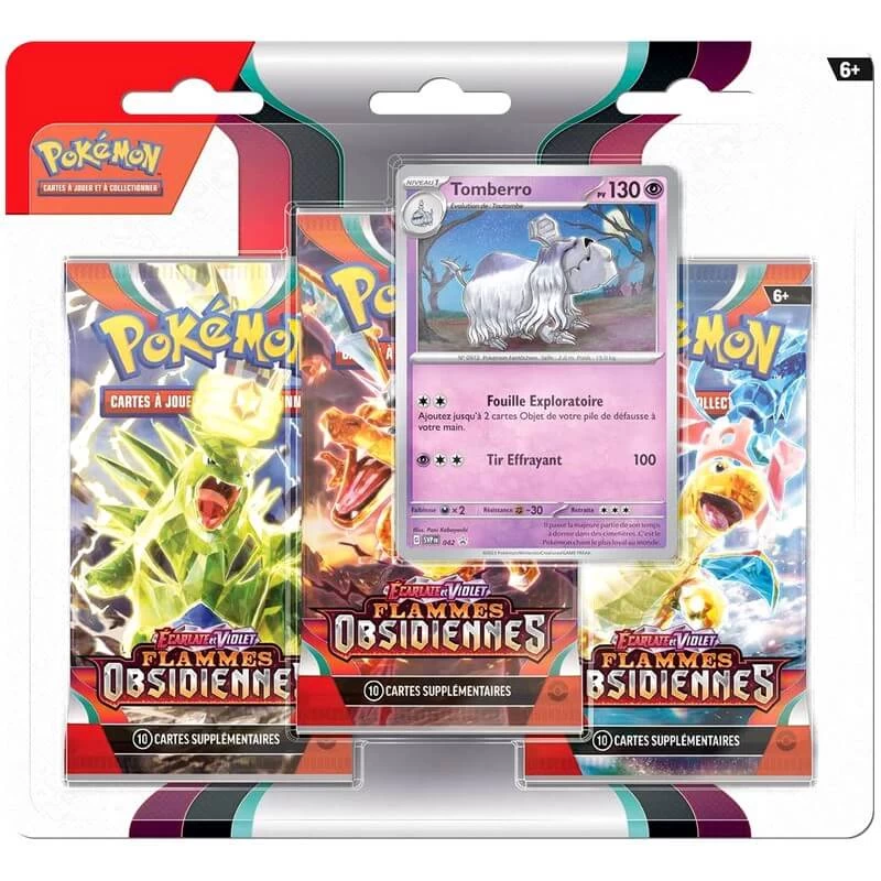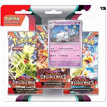 Pack contenant 3 Boosters Pokémon VF de la série EV03 : Flammes Obsidiennes, ainsi qu’une carte promo Evoli ou Tomberro.