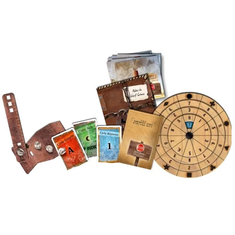 Ni une ni deux, vous vous mettez en route pour Fortune City. À votre arrivée, le shérif ne vient pas vous accueillir. Étrange ! Il semblerait qu’il ait disparu de la bourgade sans laisser de traces. Vous ne trouvez qu’un carnet lui appartenant et un étrange disque tournant.