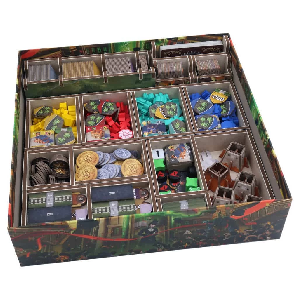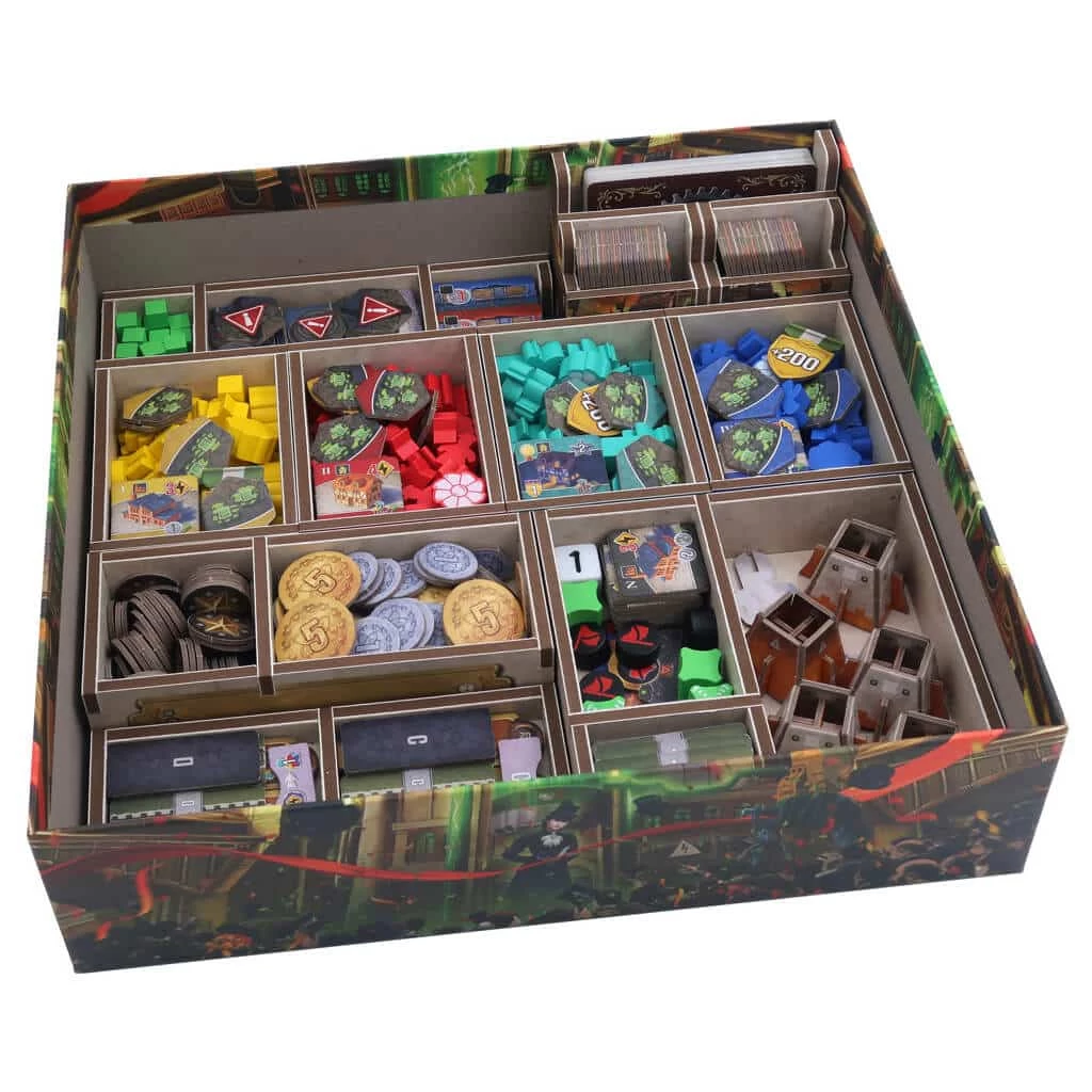 Le jeu de base et son extension Australia peuvent trouve place dans le Rangement pour Boîte Folded Space – Nucleum, dans des compartiments imprimés aux couleurs du jeu.
