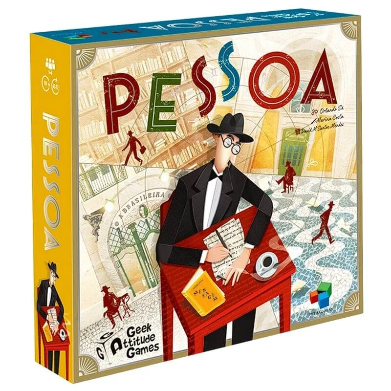 Pessoa est un jeu de placement d’ouvriers dans lequel chaque joueur interprète un des plus célèbres hétéronymes de l’écrivain : Alberto Caeiro, Ricardo Reis, Álvaro de Campos ou Bernardo Soares. Vous devrez vous déplacer entre l’espace métaphysique de la tête de Pessoa et les espaces physiques de Lisbonne pour vous inspirer des cafés emblématiques, visiter les librairies pour enrichir votre bibliothèque et vos connaissances, et chercher l’inspiration pour écrire des poèmes, marquant ainsi des points de victoire.