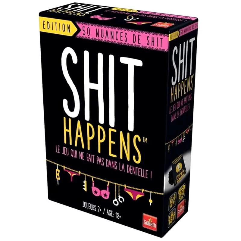 Dans Shit Happens : 50 Nuances de Shit, il y a des trucs vraiment cochons qui t’attendent. Vous lirez les cartes et classerez les cartes en fonction de leur merde. Le port de sous-vêtements trop serrés est-il MEILLEUR ou PIRE qu’une séance de formation de 4 heures sur le harcèlement sexuel ? Est-ce pire que d’avoir un suçon géant sur le cou ? Classez la carte, et si notre Index de Merde est d’accord avec vous, vous pouvez la garder. Rangez correctement 10 cartes et vous gagnez ! Pour 2 joueurs ou plus.