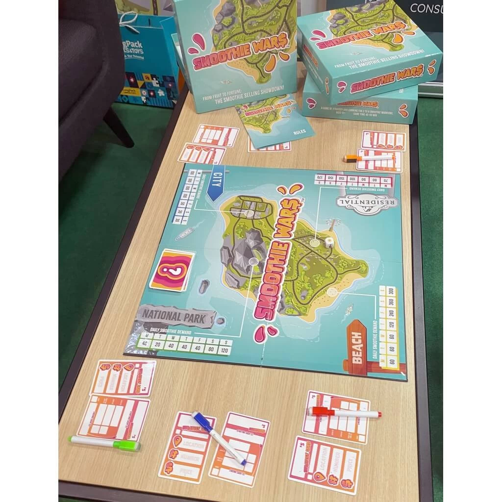 Smoothie Wars est un jeu stratégique dans lequel les joueurs s’affrontent pour vendre des smoothies aux fruits frais à différents endroits d’une île tropicale. Le jeu se déroule sur une semaine imaginaire, chaque tour représentant une journée.