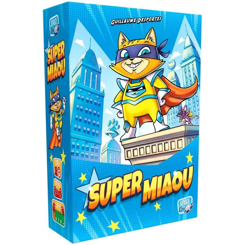 Recrutez Super-miaou, le super-chat ! Réussissez à l’attirer en lui offrant sa pâtée préférée et trouvez-lui un costume digne de ses exploits. À partir des mêmes cartes de départ, chaque joueur compose son propre paquet de cartes en les obtenant au marché ou à la banque.