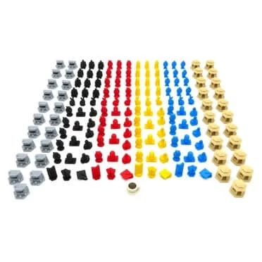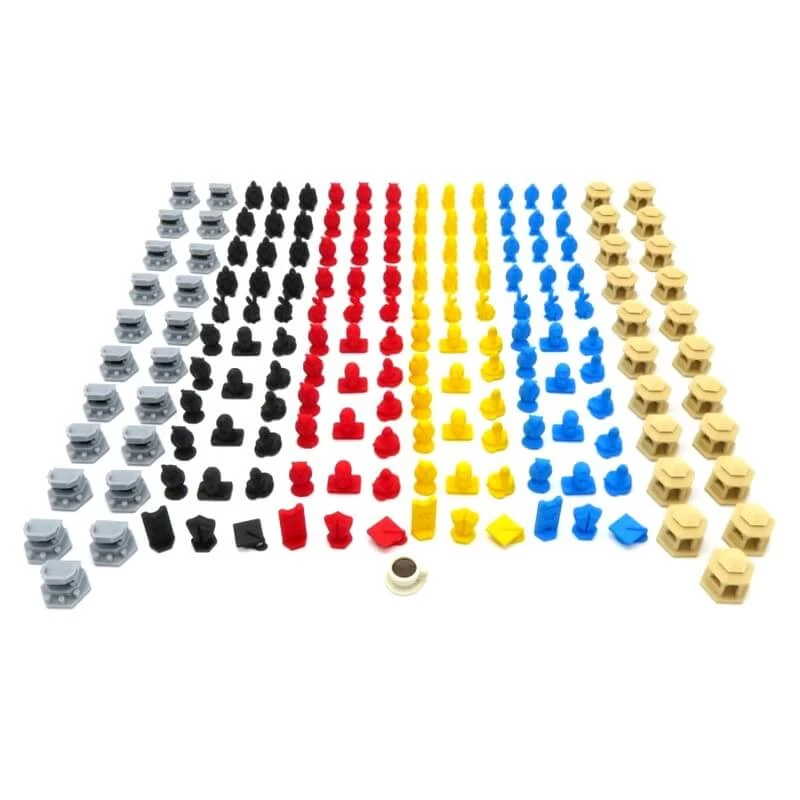 Toutes les pièces ont des dimensions similaires à celles des jetons originaux qu’elles remplacent pour s’adapter parfaitement au plateau.