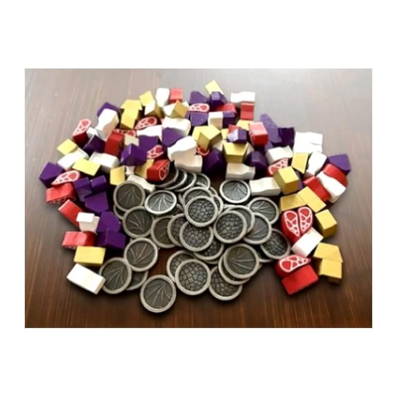 Toutes les pièces de métal sont identiques et les jetons de ressources sont au nombre de 26 : viande, gemme, or et lait.